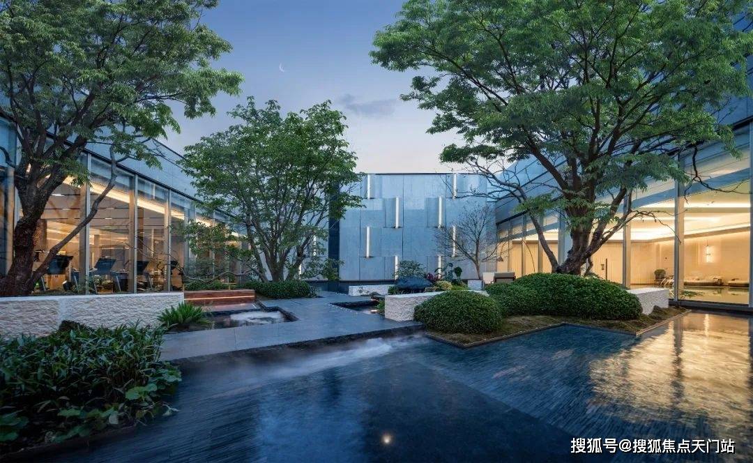 ,7米高磅礴大气的跌水景墙配合三棵参天乌桕林和原石、浮桥交错的地面水景,若是傍晚归家,还能欣赏倒映在水中的点点星光,可谓满满的奢雅意境和尊贵仪式感!编辑