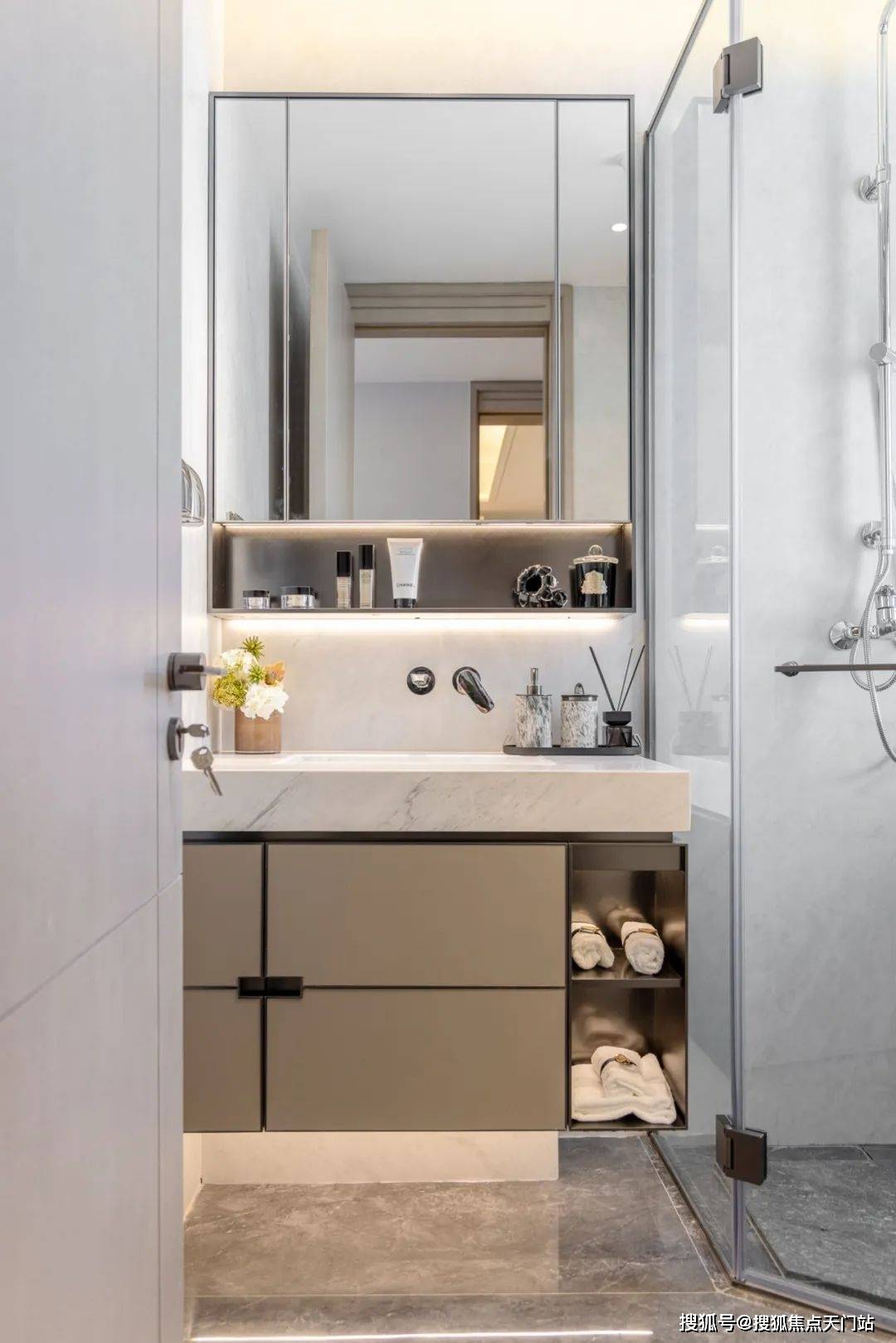 台盆柜、镜柜及玻璃淋浴房均为金茂定制,从材质到设计,无不透露出对精致生活的追求。编辑